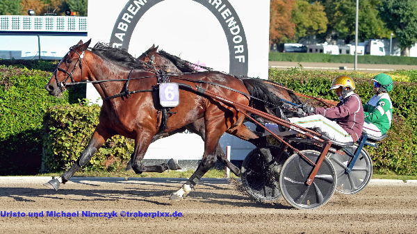 Viele Trainingsquartiere nutzen den ungewohnten Samstagtermin, um bei optimalen äußeren Bedingungen und strahlendem Sonnenschein noch einmal für das neben dem Derby wichtigste Ereignis des deutschen Trabrennsports zu proben. Nämlich für die Breeders Crown, die am 18. und 19. Oktober auf der Mariendorfer Bahn stattfinden wird. Insgesamt acht Prüfungen wurden ausgetragen, wobei die größte Aufmerksamkeit auf einem mit 10.000 Euro Preisgeld dotierten Rennen für vierjährige Pferde ruhte. Der Wettkampf mündete in ein langgezogenes Duell zwischen dem von Michael Nimczyk pilotierten Uristo und seinem Widersacher Newcomer Vici (Victor Gentz), der sofort die Führung übernommen hatte. Michael Nimczyk („Ich wollte gar auf keinen Fall eingebaut werden.“), der sich ebenfalls energisch um die Spitze bemüht hatte, blieb nichts anderes übrig, als die Außenspur zu wählen und diese Entscheidung erwies sich als richtig. Denn trotz des gewaltigen Pensums legte Uristo auf der Schlusshalben problemlos zu und zog in der Tagesbestzeit von 13,7/1.900m mit einer halben Länge Vorsprung an dem ebenfalls überaus tapferen Newcomer Vici vorbei.