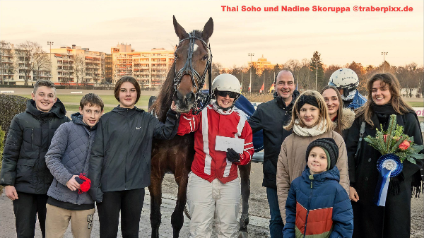 Neben der von Andrala gewonnenen Prüfung waren noch zwei weitere Rennen mit der TippelTom-Talentförderung verknüpft. Im ersten dieser beiden sah zunächst alles nach einem Erfolg von Eagle Spav und Lasse Grundhöfer aus, die vor den Tribünen an Thai Soho und Nadine Skoruppa vorbei nach vorne vorgestoßen waren und die Ziellinie als Erste überquerten. Doch die Rennleitung nahm die letzten 400 Meter noch einmal genau unter die Lupe und stellte eine erhebliche Fahrspurveränderung des vermeintlichen Siegers fest. Da der Abstand zu Thai Soho am Zielpfosten sehr knapp war, wurde Eagle Spav hinter die Gegnerin auf den zweiten Rang zurückgesetzt. Damit war für Nadine Skoruppa aber längst nicht alles vorbei – denn mit dem 52,5-Riesenaußenseiter Camino gelang der sympathischen Sportlerin ein geradezu sensationeller weiterer Coup. Nach einem geschonten Verlauf als zweites Pferd innen war der Sechsjährige in 15,9/1.900m genau rechtzeitig zur Stelle und bescherte seiner Fahrerin sowie dem einzigen Gewinner der V7+ Wette (Quote 50.000 : 1) pure Glücksgefühle.