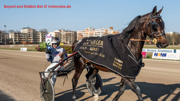 Das Mariendorfer Publikum hatte aber natürlich vor allem den ersten Lauf der diesjährigen Gold-Serie im Visier, denn er war mit stattlichen 20.000 Euro Preisgeld dotiert und das achtköpfige Teilnehmerfeld war exquisit. Um das Kommando entbrannte zwischen Tyron Hill (Josef Franzl) und Bayard (Robbin Bot) sofort ein heißer Fight, der beide Konkurrenten auf den ersten 300 Metern zu einer Durchgangszeit von 04,8 trieb. Sie besaßen dadurch einen erheblichen Vorsprung auf die Verfolger – lediglich Orkan Bo (Marciano Hauber) blieb an ihnen dran. Nachdem sich Tyron Hill für die Führung durchgesetzt hatte und das Tempo in Front auch im weiteren Verlauf nie abflauen ließ, schien der Hengst zunächst alle Trümpfe in der Hand zu halten. Doch bereits im Schlussbogen deutete Tyron Hill einen Fehler an und mit Erreichen des Einlaufs erfolgte tatsächlich das endgültige Aus. Robbin Bot und Bayard ergriffen sofort die Chance und waren am Pfosten in der sensationellen Kilometerzeit von 10,9/1.900m für den Besitzerstall Germania mit vier Längen voraus. Der auf der Schlusshalben immer stärker werdende Hooper des Chasses (Danny Brouwer) sicherte sich eine halbe Länge vor dem tapfer durchziehenden Orkan Bo das zweite Geld.